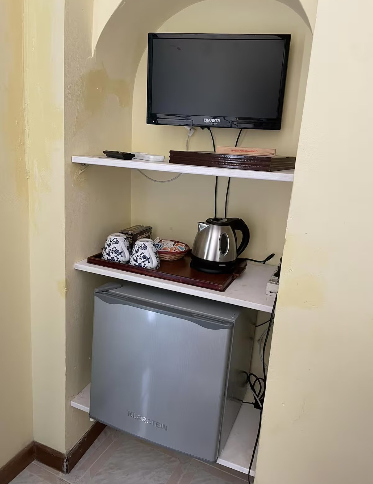 Kühlschrank und Wasserkocher werden bereitgestellt.